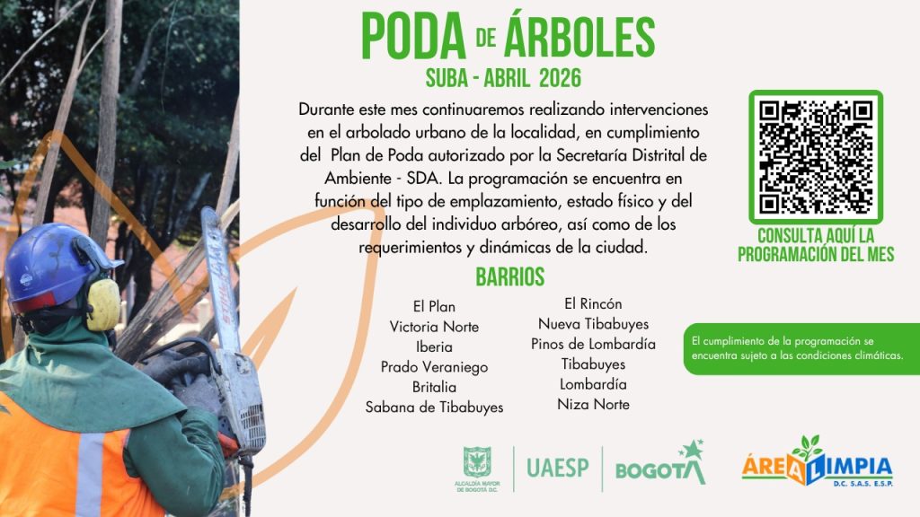 PODA DE ÁRBOLES – ABRIL 2026 Públicado en 30 marzo, 202630 marzo, 2026 por Camilo Ardila Apreciados usuarios de la localidad de Suba, compartimos con ustedes la programación de los barrios donde estaremos en el mes de abril, realizando la actividad del servicio de Poda de Árboles